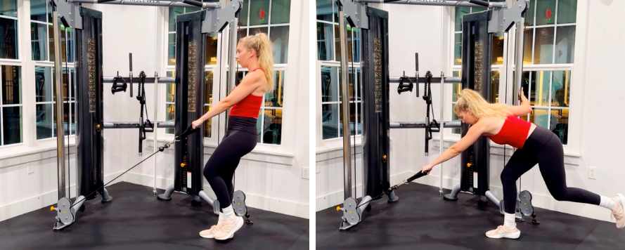 - The right leg should come off the ground as you bend. The handle should move closer to the cable machine.